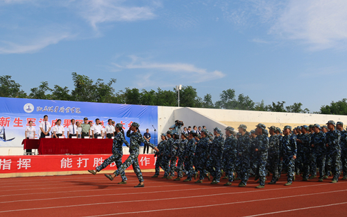 运动场上,2017级新生迈着铿锵有力的步伐,精神抖擞地依次从主席台前走过,接受学院领导及部队首长的检阅,受阅方队坚定的步伐、整齐划一的队列、嘹亮的口号,充分展现出十几天军训取得的成果,同学们刚入校时那一张张稚嫩的脸庞,虽已变得黝黑粗糙,但却挂满了坚毅、果敢、自信、拼搏和对即将开始的大学生活的向往。