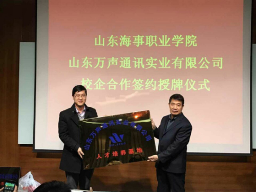 12月1日,“山东海事职业学院、山东万声通讯实业有限公司校企合作签约授牌仪式”在山东万声通讯实业有限公司(以下简称山东万声)A楼会议室举行,学院副院长李振鹏、山东万声招聘部总经理李成欣作为双方代表在校企合作协议书上签字, “山东万声通讯实业有限公司人才培养基地”正式落户山东海事职业学院。