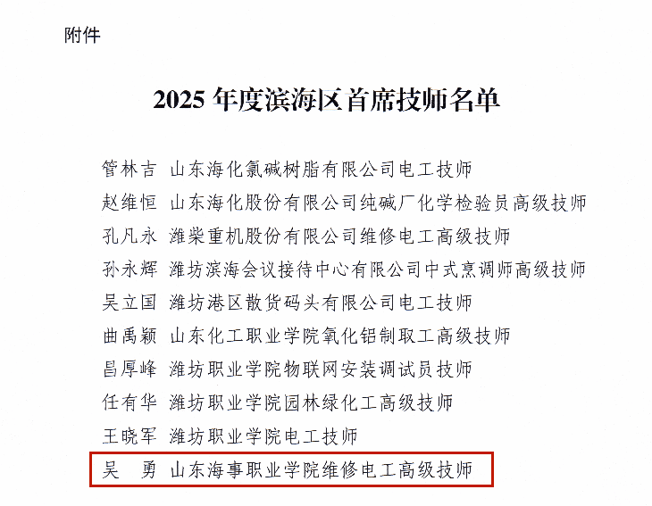 近日,滨海区党群工作部正式公布“2025年度滨海区首席技师”评选结果,我校机电工程学院电气教研室主任吴勇老师凭借深厚的专业功底与卓越的育人成效成功当选。