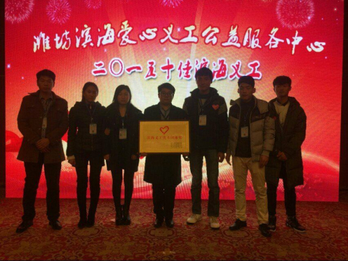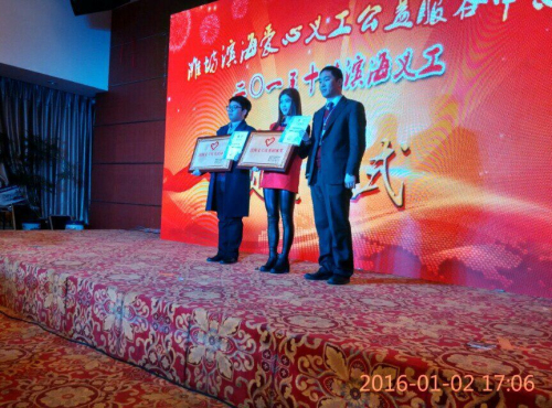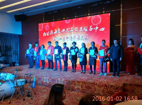 2016年1月2日,由滨海义工服务中心主办的以“爱心公益,你我同行”为主题的首届爱心义工颁奖晚会在潍坊滨海海正大酒店隆重举行。鸢都义工理事长孙志达,山东海事职业学院张建军老师,滨海义工崔同磊、张国梁等100多名义工出席了颁奖晚会。
