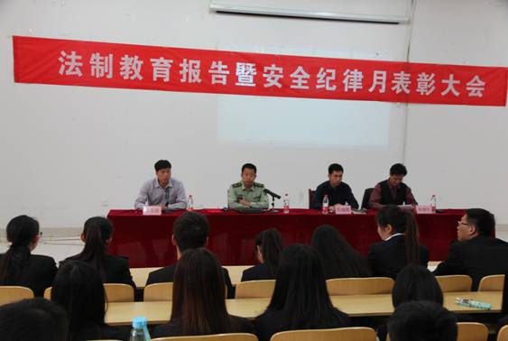 沈鸿周教导员围绕 “安全第一,预防为主”的主题作了一场生动的法制教育报告。他结合有关法律知识及近几年高校发生的一个个触目惊心的案例,向同学们讲述了违法犯罪的形式和危害,分析当前青年违法犯罪的原因及预防对策。他指出,遵纪守法是对公民的基本要求,当代大学生更应该遵纪守法,保护自己的合法权益不受伤害。违法犯罪离同学们并不遥远,同学们应该提高自我防范意识,远离诈骗、传销和盗窃,并且严于律己,不做危害社会的事。同时,他向同学们讲解了防火防水等安全注意事项,并告诫同学们珍惜生命,爱护自我。