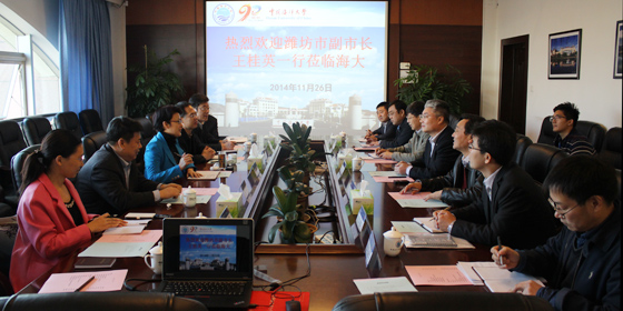 11月26日上午,潍坊市副市长王桂英一行7人到中国海洋大学调研合作办学事宜,校长于志刚、副校长李巍然在崂山校区行远楼第三会议室欢迎客人的到来,并举行座谈会,双方就合作办学、科研合作等事宜进行了探讨。