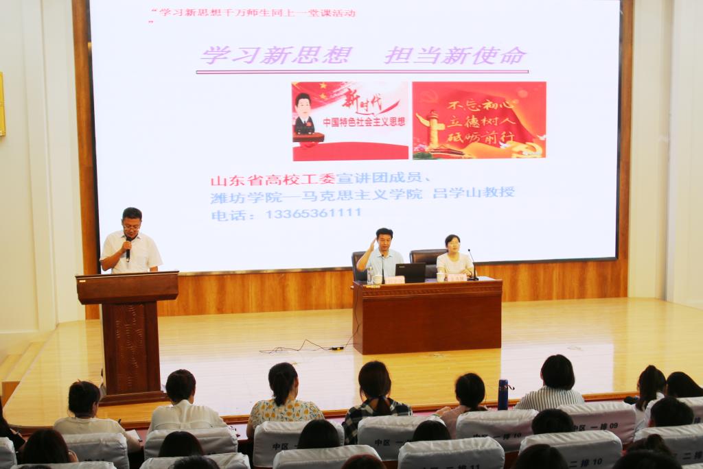 主讲嘉宾、山东省高校工委、山东省社科联党的十九大精神宣讲团成员、潍坊学院、马克思主义学院“形势与政策”教研室主任吕学山教授,以《学习新思想,担当新使命》为题,从“一个根本任务”“两个标准”“三项基础性工作”和“四点希望”对总书记在北京大学师生座谈会的讲话内容作了阐述,从“三个一生”、“四个理论”、“三个飞跃”、“九个思想”解读了总书记在纪念马克思诞辰200周年大会上的重要讲话精神,还重点就党的十九大的主题、习近平新时代中国特色社会主义思想、十八大以来近五年的历史性成就、中国特色社会主义进入新时代、我国社会主要矛盾的转化、社会主义现代化建设新征程的战略安排、今后工作的新部署、全面从严治党的顶层设计与战略部署等八个方面进行了全面、准确的解读。