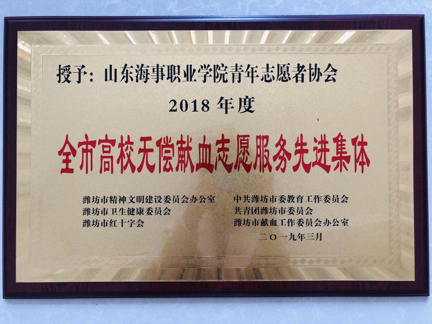 近日,2018年潍坊市高校无偿献血工作会议在山东交通职业学院举行,会上通报表彰了2018年全市高校无偿献血工作先进集体和先进个人,学院荣获“2018年度全市高校无偿献血志愿服务先进集体”荣誉称号,团委书记李雪、电商学院学生葛立豹荣获“2018年度全市高校无偿献血工作先进个人”荣誉称号,陈博、张庆效两名同学荣获“2018年度全市高校无偿献血志愿服务先进个人”荣誉称号,王正赢、翟建顺两名同学荣获”2018年度全市无偿献血爱心大学生”荣誉称号。2018年,在学院领导的高度重视和相关部门积极组织协调下,学院开展了“关爱生命,无偿献血”活动,学院通过举办多次献血知识公益讲座,利用校园广播站以及微信、微博等新媒体途径,进行了多种形式的广泛宣传,献血人数高达700余人,参与献血工作志愿服务的同学80余人,学院总献血数量超过170000毫升。荣誉属于每一位参与宣传、奉献鲜血的老师和同学们,今年,学院将继续重视并积极组织做好无偿献血工作,营造积极的献血氛围,积极弘扬助人为乐的奉献理念,鼓励和呼吁更多富有爱心的同学参与到献血活动中来。