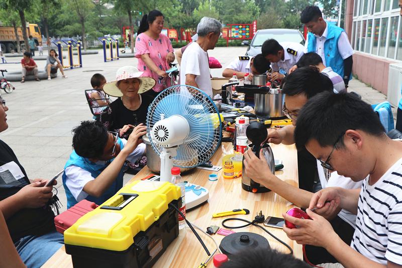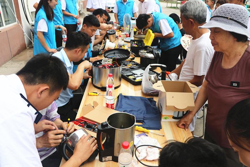 家电义务维修活动开始后,社区居民闻讯纷纷拿出家中需要维修的家电和电气前来咨询、维修,维修学生仔细检查家电损毁程度和状况。机电与信息工程学院专业教师为社区居民进行了详细的指导和解答,学生用所学专业知识竭诚为居民排忧解难,做好服务。据统计,活动现场共维修电饼铛、收音机、电压力锅、电吹风、电饭锅、热水壶等小家用电器53余件,修复50件,其余无法维修的电器,也向居民逐一说明了原因和解决办法。修理活动进行过程中,维修队员也向居民普及了电器的使用和保养方法。大家把课堂所学的科技小知识传递给社区居民,受到了居民们的普遍认可和一致好评。