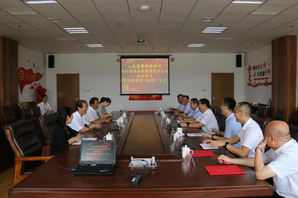 潍坊滨海旅游集团有限公司总经理吴明远,山东海事职业学院党委书记、校长王敬良先后致辞。双方共同表示,实施校企战略合作,坚持在专业与需求、课程与职业、教学与生产等方面进行深度对接,能够最大程度地挖掘双方的需求和利益结合点,充分发挥各自优势,促进双方在人才培养、社会服务、创新创业等领域真正实现互惠互利、共同发展;同时,也着力培养一批适应新旧动能转换要求的高素质技术技能型人才,为我省“十强”产业发展、新旧动能转换提供更加有力的人才保障和技术支撑。双方今后合作领域将以与国际邮轮与旅游学院合作为突破口,深入开展协同育人,实训基地共建,大师工作室共建等项目。