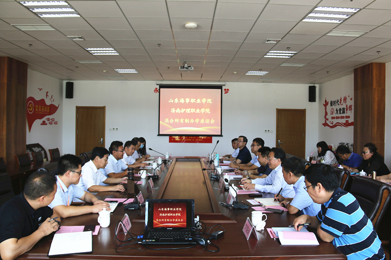 座谈会上,学校党委副书记、副校长徐立清首先代表学校向济南护理职业学院张院长一行来学校考察交流表示热烈欢迎,并详细介绍了学校混合所有制办学发展历程、办学成果和现今发展状况。双方共同观看了学校混合制办学发展成果纪实宣传片。济南护理职业学院张院长对学校混合制办学发展状况表示高度赞肯,并介绍了参与此次考察交流活动的人员情况及考察交流目的。张院长表示,山东海事职业学院已成为全省甚至全国混合所有制办学领域的佼佼者,希望通过此次考察交流活动学习借鉴有益优质的混合制办学改革实践方法,探索面向市场办学的职业化办学路径。徐书记进一步向来宾介绍了学校混合所有制二级学院校企合作办学建设发展情况。并就学校混合制办学研究联盟发展,社会培训办学,优秀创新创业学生典型,混合制办学效益产出等情况作了重点介绍。李校长围绕学校兼具公办学校的规范性和民办学校的灵活性的混合制办学典型优势向来宾介绍了一系列职教混改办学经验。研究室郭主任围绕来宾重点关注的职教混改方式方法问题,立足国家相关政策,从学术研究角度,结合不同类型学校混合制改革典型案例和学校混合制办学内部运营管理模式给与了实践性经验介绍。双方还就师资队伍建设、人才培养、社会引资、现代法人治理结构建设、混合制二级学院建设等具体问题进行了进一步探讨交流。