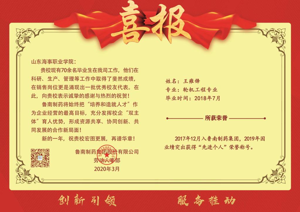 近日,学校接到鲁南制药集团股份有限公司对我校毕业学子的表彰喜报和感谢信。感谢近年来,我校70余名毕业生扎根鲁南制药集团,在生产、科研、管理、销售等工作岗位上爱岗敬业,扎实工作,为企业发展做出的杰出贡献,感谢学校为鲁南制药集团输送的优秀人才。