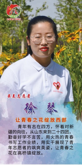 徐琴同学去年7月份响应国家号召,通过层层考核成为一名光荣的大学生志愿服务西部志愿者,一年来扎根兵团在基层工作岗位上兢兢业业无私奉献,取得了骄人的成绩,充分展现了我校大学生的风采。