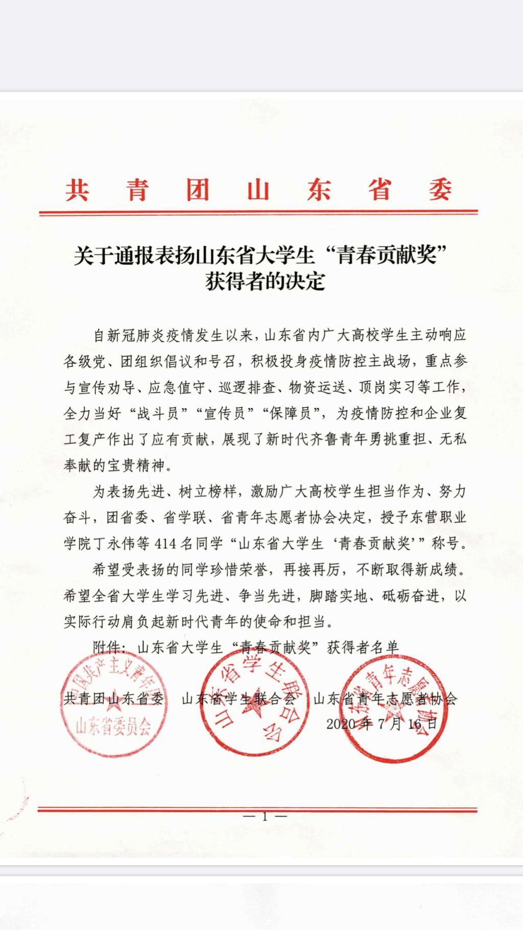 近日,共青团山东省委、山东省学生联合会、山东省青年志愿者协会联合印发《关于通报表扬山东省大学生“青春贡献奖”获得者的决定》,表彰了自新冠肺炎疫情发生以来,省内广大高校学生主动响应各级党、团组织倡议和号召,积极投身防疫主战场,为疫情防控作出了应有贡献的新时代齐鲁青年。我校机电与信息工程学院2019级安全技术与管理1班的李汶儒同学凭借抗击疫情期间的突出表现光荣上榜。