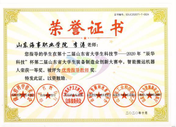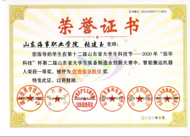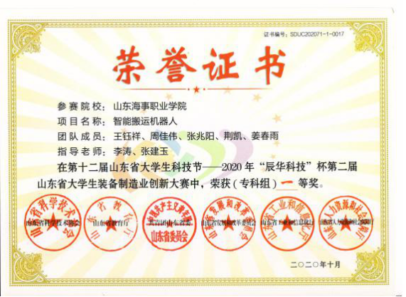 近日,由山东省机械工业科学技术协会、潍坊职业学院承办,山东辰华科技信息有限公司协办的第二届山东省大学生装备制造业创新大赛总决赛在潍坊举行,由机电与信息工程学院学生王钰祥、周佳伟、荆凯、姜春雨、张兆阳参赛,教师李涛、张建玉指导的比赛作品“智能搬运机器人”荣获一等奖。