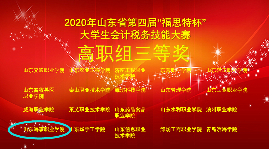 12月26日,由山东省教育厅高等教育处主办的第四届“福斯特杯”大学生会计税务技能大赛顺利举行,全省共计66所本专科院校参加了本次比赛。我校代表队首次参赛,并荣获“高职组三等奖”的优异成绩。