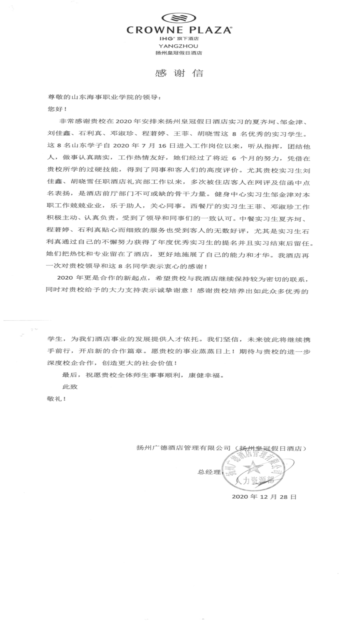 2020年7月16日,我校邮轮游艇学院的夏齐坷、邹金津、刘佳鑫、石利真、邓淑珍、程蒼婷、王菲、胡晓雪共8名实习生进入扬州皇冠假日酒店进行专业实习。实习过程中,她们听从指挥,团结他人,做事认真踏实,工作热情友好,专业技能过硬,得到了同事和客人们的高度评价。在感谢信中,扬州皇冠假日酒店充分肯定和赞赏了我校学生在实习期间展现的深厚专业功底、良好的精神风貌和团结协作精神,表达了对学校人才培养质量的肯定及衷心感谢,并殷切希望能够进一步深化与我校的合作。