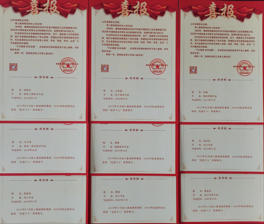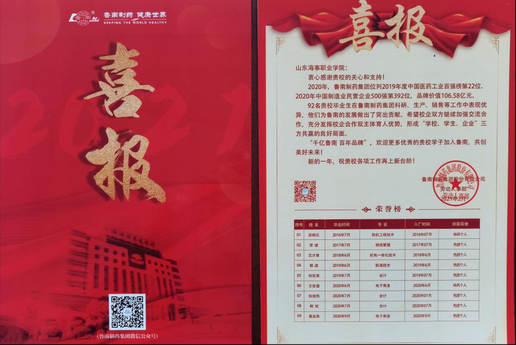 3月25日,鲁南制药集团股份有限公司送来喜报,并向学校通报了毕业生工作状况、职业发展、获奖表现等情况,感谢学校优秀学子为企业发展所做出的贡献,山海学子们的职业能力、专业技能和专注精神,得到了鲁南制药集团股份有限公司的一致褒奖。我校共有92名毕业生在该集团的科研、生产、销售等工作岗位中表现优异,为鲁南制药集团的发展做出了突出的贡献,其中宋炳元、王世通两位同学获得集团“标兵个人”,常斌、文才章、郭梁、何宗泽、张俊伟、韩旭、葛金昌七位同学获得集团“先进个人”。鲁南制药集团对学校大力输送优秀人才表示感谢,双方将进一步加强合作,优势互补,以社会需求为导向,深化产学合作育人,为学生创造良好的专业技能和职业素养教育,促进人才培养高质量发展。