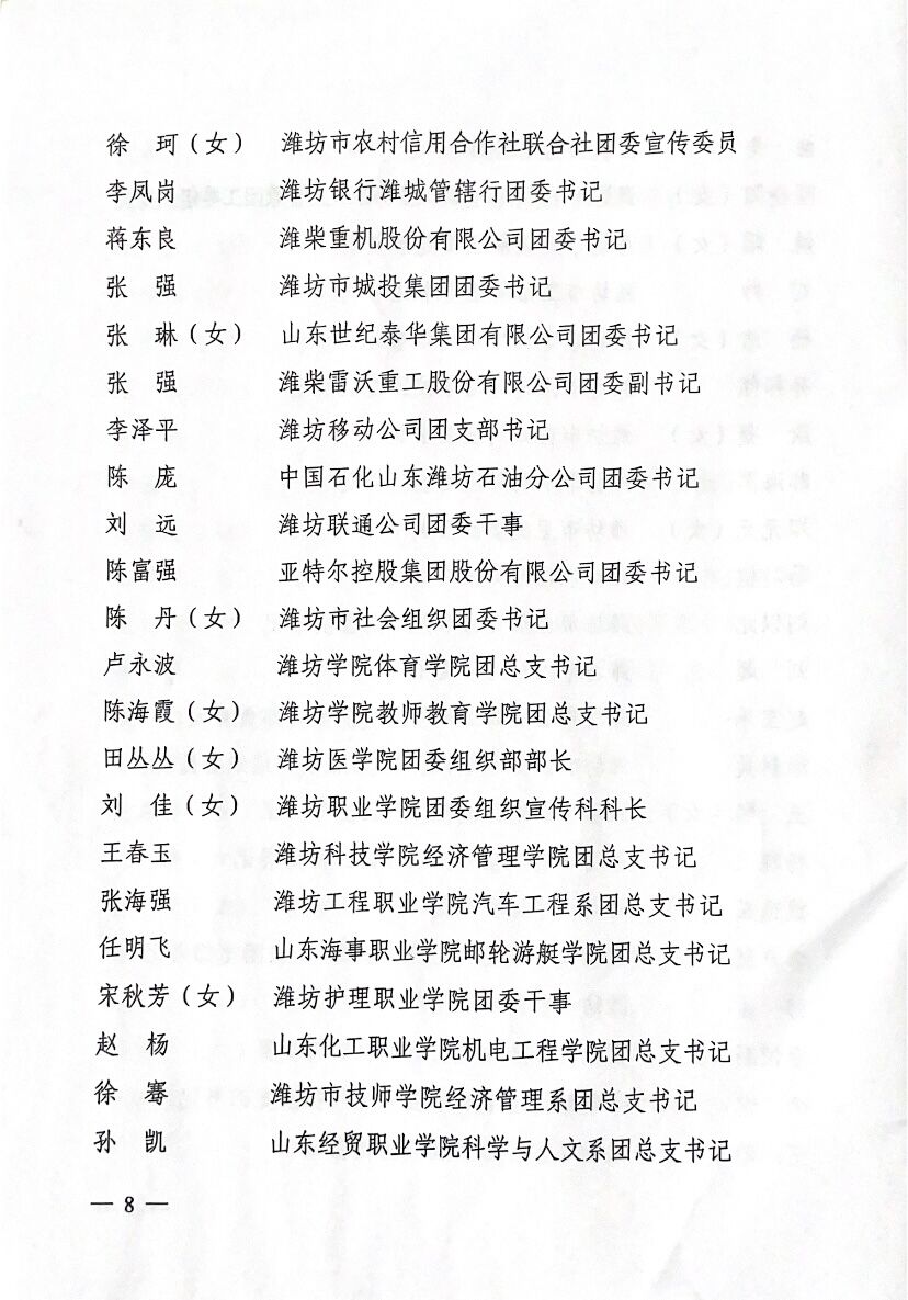 近期,团市委下发了《关于表扬2020年度“潍坊市优秀共青团员”“潍坊市优秀共青团干部”“潍坊市五四红旗团组织”“潍坊市青春担当好青年(团队)”的通报》,我校港航管理学院团总支获得“潍坊市五四红旗团组织”荣誉称号;第十届校学生会获得“青春担当好团队”荣誉称号;邮轮游艇学院团总支书记任明飞获得“潍坊市优秀共青团干部”荣誉称号;侯晓凡、周佳伟同学获得“潍坊市优秀共青团员”荣誉称号;刘颜衡同学获得“潍坊市青春担当好青年”荣誉称号。