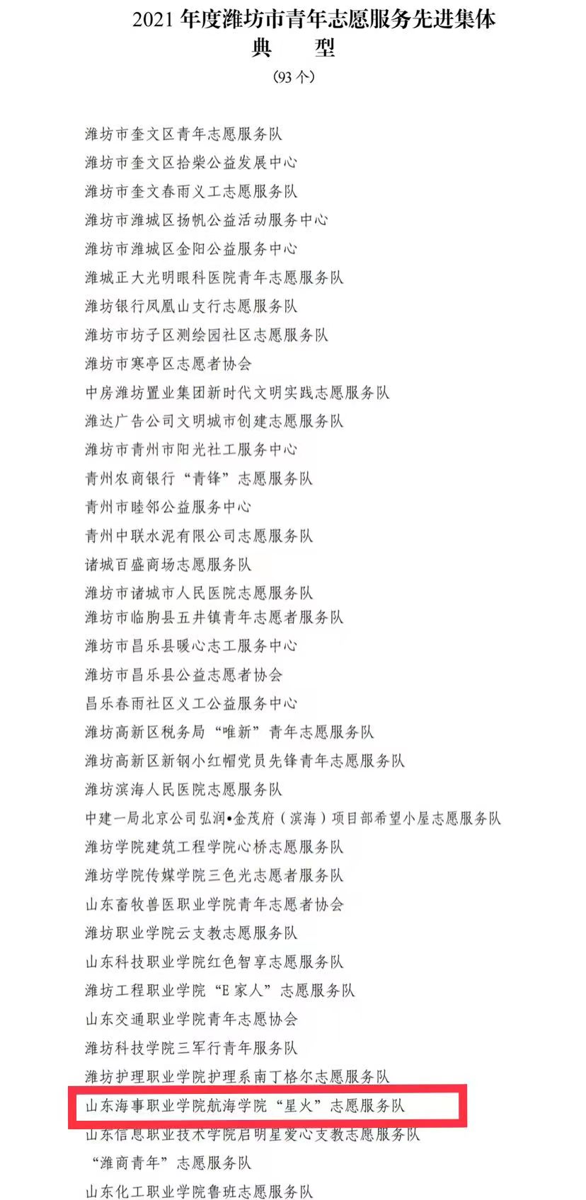 近日,共青团潍坊市委下发《关于2021年度全市青年志愿服务先进集体和先进个人典型的通报》,我校航海学院“星火”志愿者服务队荣获“2021年度潍坊市青年志愿服务先进集体典型”荣誉称号;机电工程学院王军韬老师和电商学院张思宇同学荣获“2021年度潍坊市青年志愿服务先进个人典型”荣誉称号。