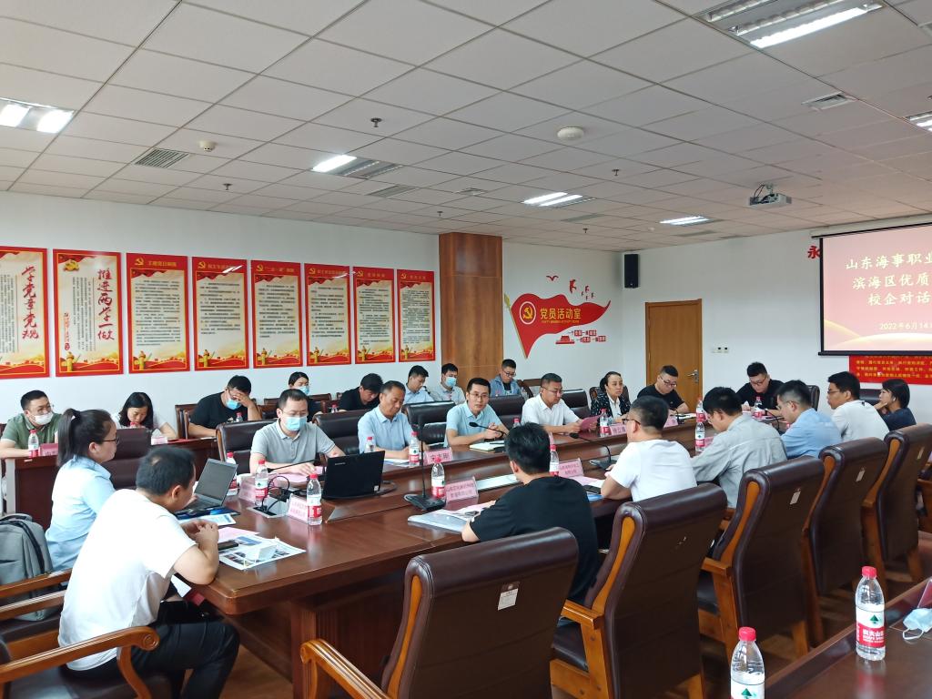6月14日下午,滨海区党群工作部举办的山东海事职业学院滨海区优质企业校企合作对话会在图书馆一楼会议室召开。会议由滨海区党群工作部副部长苏志强主持,滨海区党群工作部相关负责人;山东海化集团、新和成控股、普洛得邦、海利尔化工等18家企业相关负责人;学校党委副书记、执行校长徐立清,副校长宋志刚,以及各二级学院、相关职能部门负责人参加了会议。