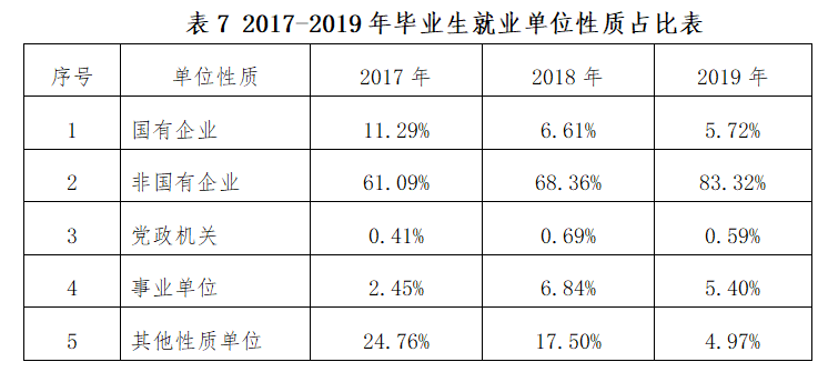 根据2017-2019年学校已就业毕业生的单位性质流向分布结果显示,企业是接收本校毕业生就业的大户,占70%-80%左右,主要以非国有企业为主,事业单位占比逐步提高,其他性质单位占比逐年缩小,党政机关比例较小。