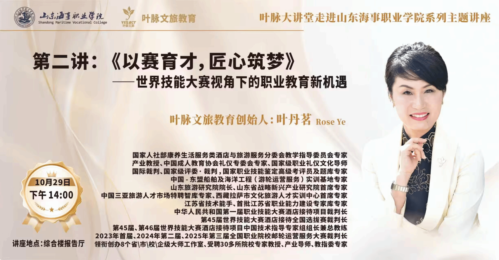 叶丹茗教授深耕职业教育领域多年,是国家人社部康养生活服务类酒店与旅游服务分委会教学指导委员会专家、产业教授,国际裁判、国家级评委及裁判,第45届、第46届世界技能大赛酒店接待项目中国技术指导专家组组长兼总教练,在文旅人才培养、世赛国赛执裁、职业培训等方面享有极高声誉。