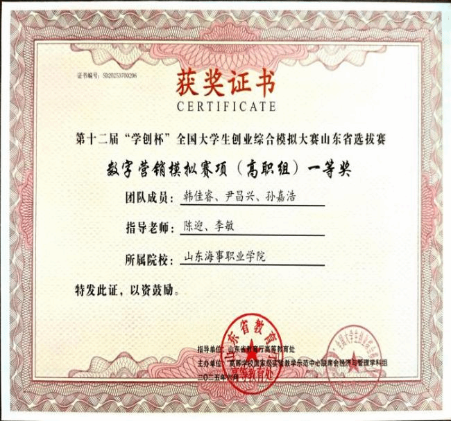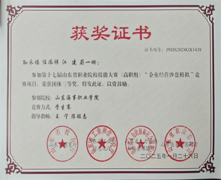 二是竞赛竞优提能力。搭建“竞赛孵化平台”,组建20支专项竞赛团队,由竞赛经验丰富的指导老师带队,对接专业课程开展赛前培训,参与省级及以上竞赛20余项。先后荣获2025年第十九届“挑战杯”省二等奖1项;2025年国际大学生创新大赛山东省铜奖1项;2024年第十六届山东省职业院校技能大赛“市场营销”赛项省1等奖、2025年第十七届山东省职业院校技能大赛“市场营销”赛项省3等奖、2025年第十七届山东省职业院校技能大赛“企业经营沙盘模拟”赛项省3等奖;2024年“学创杯”全国大学生创业大赛国家级特等奖3项、一等奖2项、省一等奖5项;一带一路暨金砖国家技能发展与技术创新大赛二等奖等,共荣获省级及以上竞赛奖项25项。