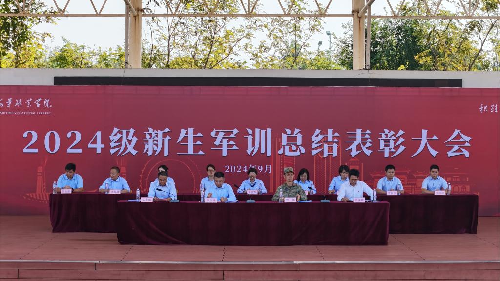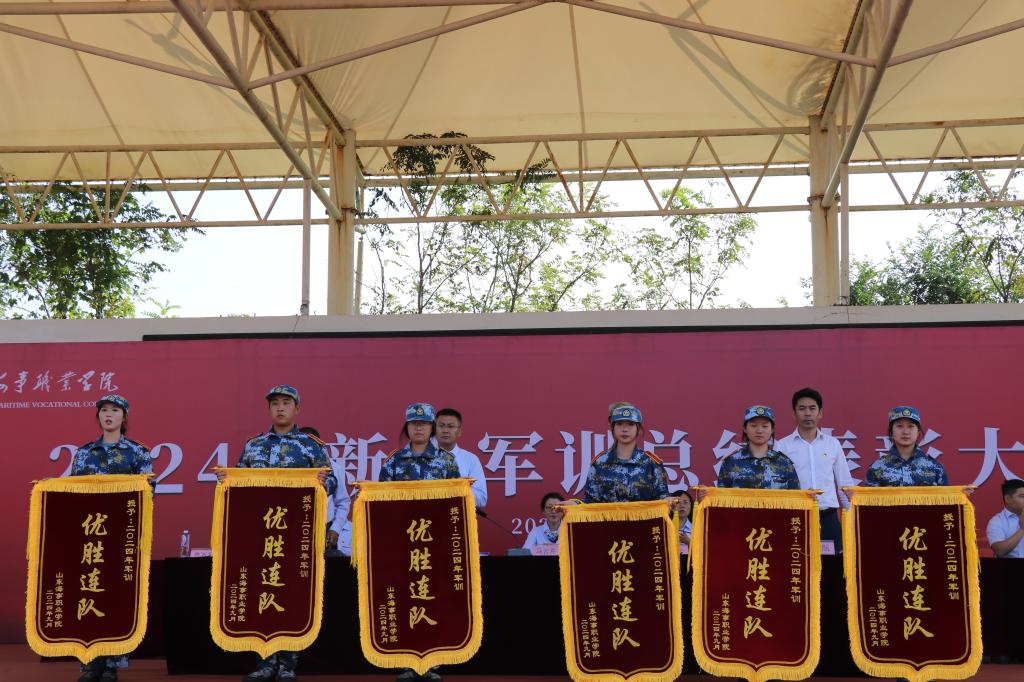 副校长仉继航宣读《山东海事职业学院关于表彰2024级新生军训优胜连队、优秀组织连队、军训优秀标兵的决定》,参会领导为获奖单位和个人进行颁奖。