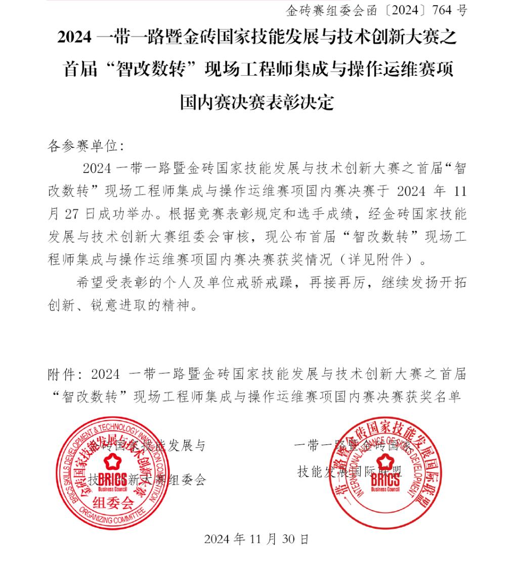 近日,2024一带一路暨金砖国家技能发展与技术创新大赛之首届“智改数转”现场工程师集成与操作运维赛项国内赛决赛成绩公布,我校荣获一等奖、二等奖和优秀奖各1项,机电工程学院教师王岸青、都新荣荣获“优秀指导教师奖”,学校荣获“最佳组织奖”。
