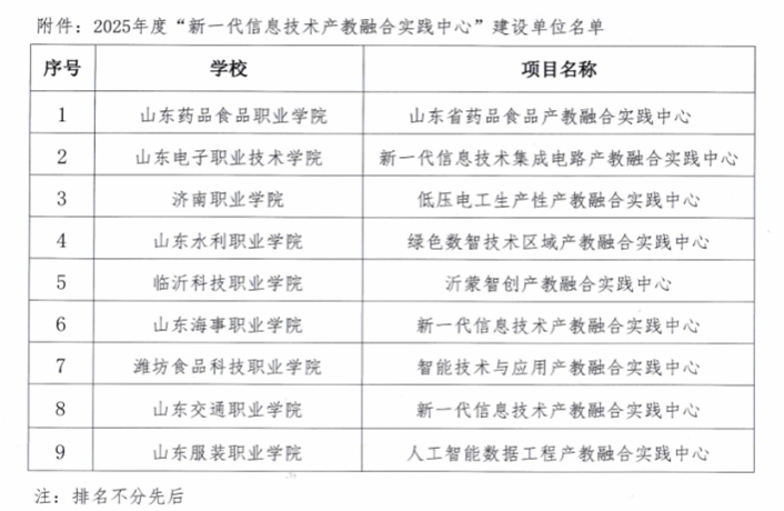近日,山东省职业教育和产业人才研究院公布2025年度“新一代信息技术产教融合实践中心”建设单位名单,我校凭借鲜明的专业特色与扎实的建设基础成功入选。