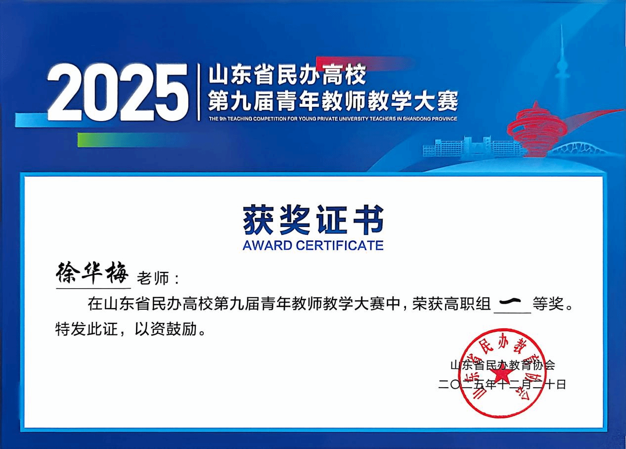近日,山东省民办教育协会主办的第九届民办高校青年教师教学大赛决赛圆满落幕。我校健康管理学院教师徐华梅在高职组决赛中表现优异,荣获一等奖。