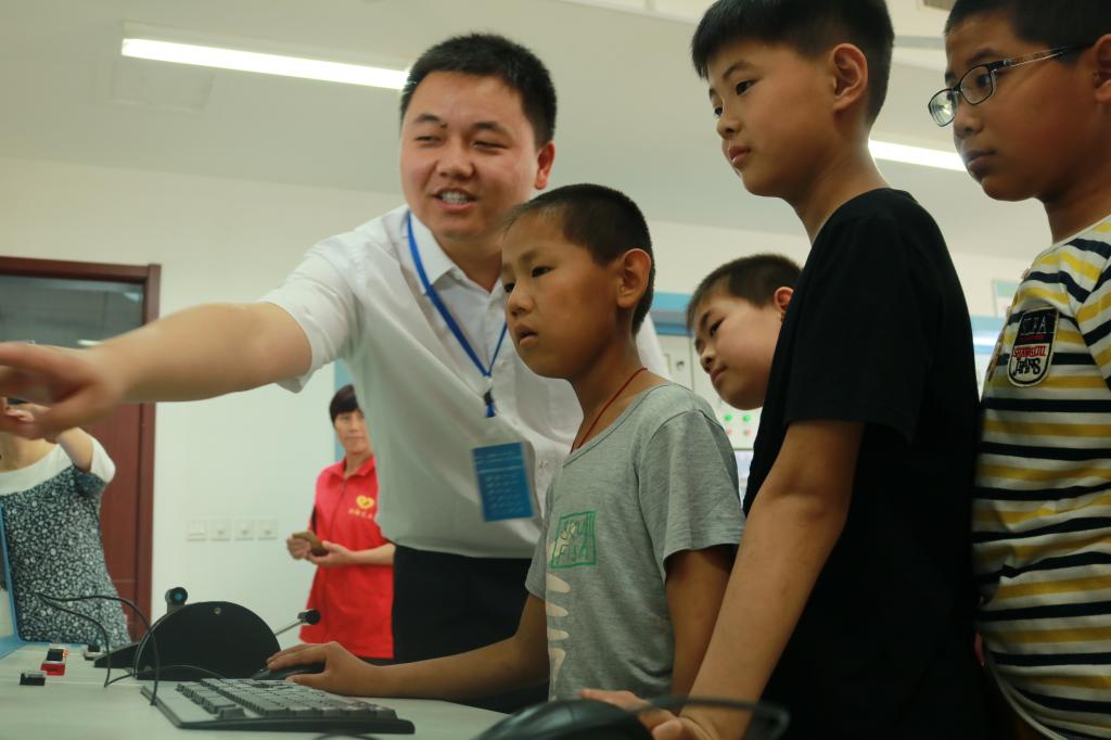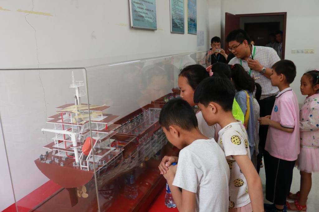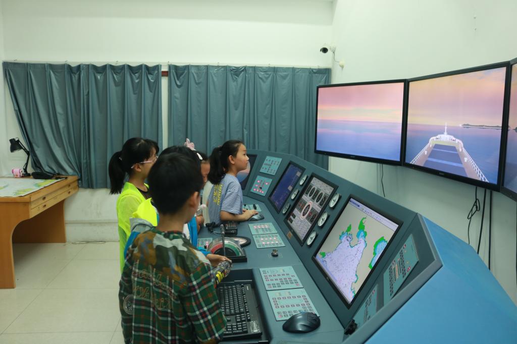 蓝海小学的26名小学生在老师和志愿者的带领下,参观了航海模拟器(BRM)、船模陈列室、精通急救实训室、轮机模拟器(ERM)及航空实训楼。在航海模拟器实训室,志愿者带领小学生们真实体验了大风浪天气中船舶的操控;在精通急救实训室,小学生们在志愿者的引导下进行了系统的心肺复苏术的学习,进行了现场模拟训练,了解急救方面的知识;最后,学生们进入了模拟机舱,了解了机舱基本构造和船舶动力的来源及机械运转的原理。