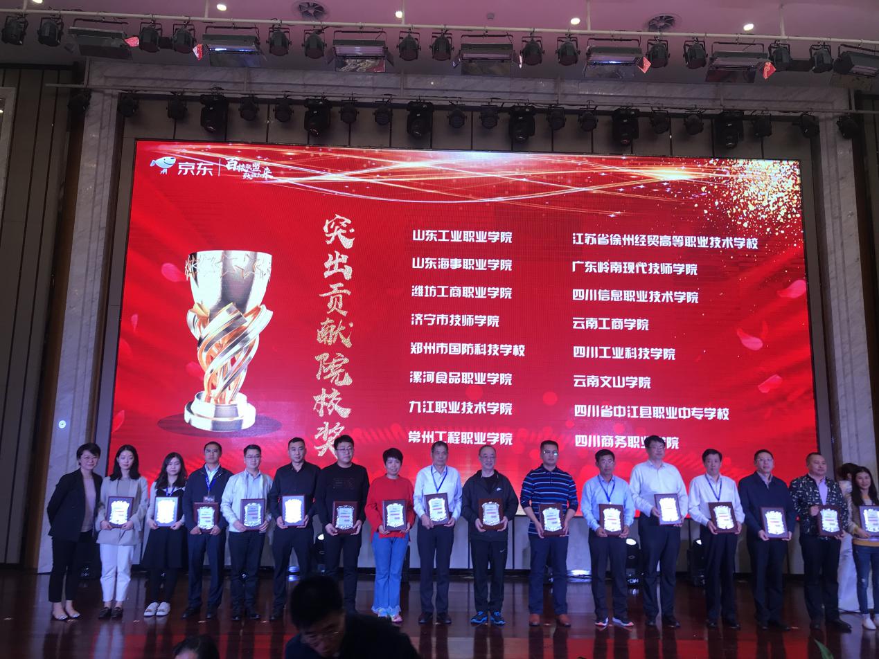 我校与京东的良好合作始于2017年,因教学成果突出,每年为京东输送大批优秀专业人才而先后荣获“卓越贡献奖”、“优秀合作院校”奖等奖项。2019年,学校荣获“突出贡献院校奖”,副校长张庆会代表学校领奖,电商学院副院长韩超荣获“卓越贡献个人奖”。