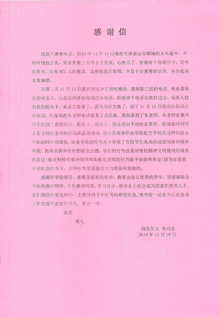当时是11月15日的凌晨三点,桑冲同学在回家返校途中于郓城火车站停留,凌晨的车站里车疏人稀,派出所人员已下班,桑冲同学在车站等了一段时间,没有失主前来认领。由于还急于赶火车,桑冲同学便携带着钱包回到了学校,一早便迫不及待的把钱包交给了辅导员老师。根据学校航空学院领导指示,辅导员老师便依据钱包内社保卡信息联系到当地社保机构,通过在社保卡的个人信息与失主取得联系,确认失主信息及钱卡无误后,辅导员老师和桑冲同学悬着的心终于放下了。按照失主提供的地址信息,桑冲同学通过顺丰快递把钱包顺利寄到家住天津的失主李女士手中。失主看到钱包失而复得并且钱卡无一丢失后十分激动和高兴,直夸桑冲同学是拾金不昧的好青年,一再表示要从天津来学校当面感谢朱老师和桑冲同学,被老师婉言谢绝。事后,天津失主李女士专门写来感谢信、寄来锦旗,对桑冲同学拾金不昧的高尚行为表示由衷的谢意。