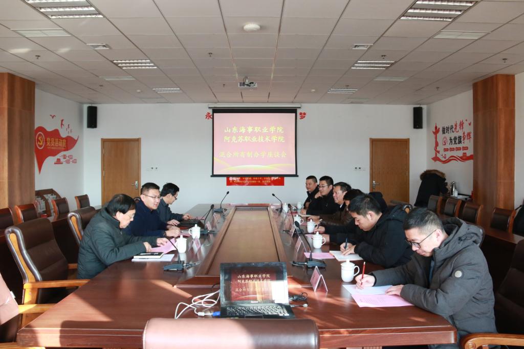 座谈会上,徐校长首先对阿克苏职业技术学院邱院长一行从新疆专程来校访问交流表示热烈欢迎。并结合学校专业特色全面介绍了学校建校背景、发展历程和办学成果。立足潍坊地区职教发展情况、学校混合制办学概况和国家职教政策发展详细介绍了职教混合制办学发展趋势和发展方向,并细致介绍了学校承办全国混合所有制办学研究联盟的发展情况和学校国际海洋工程实训基地(OPITO)建设发展现状。邱院长对学校混合制办学现状及全国混合所有制办学研究联盟社会影响力表示高度赞肯,并结合新疆和阿克苏地区自然环境、人文历史和高等教育发展情况介绍了阿克苏职业技术学院办学发展现状,并希望两校能够不断加强沟通交流,共同探索职教混改新层面。双方共同观看了学校混合制办学成果纪实宣传片。学校研究室郭主任结合第三届全国混合所有制研究联盟举办情况简要剖析了新疆地区职教发展政策环境。立足学校重点教改项目《混合制职业学院办学模式研究》向来宾全面介绍了学校教育教学创新改革和混合制办学典型经验,对混合制大框架下如何探索产教融合育人从多纬度做了清晰阐述。并立足国家宏观政策制度建设和微观社会经济发展介绍了学校职业教育混合制办学发展优势和动力、阐述了职教混改的办学逻辑和办学理念。现代教育技术中心白主任结合学校信息化教学创新发展及教育教学成果向来宾全面介绍了学校产教融通教学体系中现代化信息技术教育教学理念和教学方式。双方还就校企合作路径、实训基地建设、师资队伍建设、产权明晰等进行了深入研讨交流。