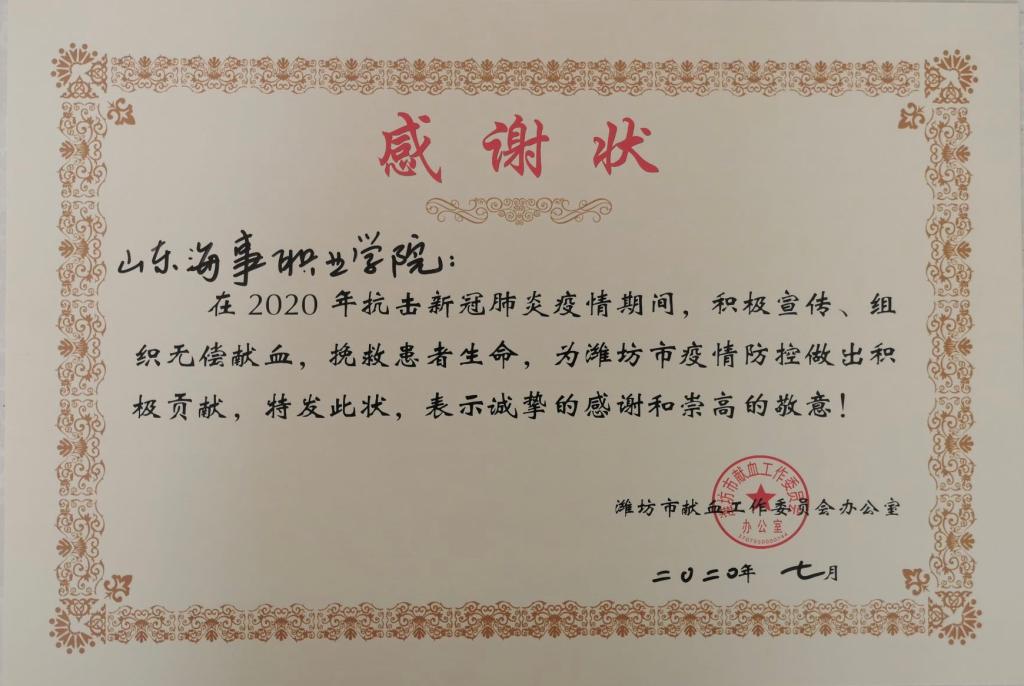 9月11日,由潍坊市中心血站组织的全市高校无偿献血经验交流会在潍坊滨海会议接待中心如期召开。潍坊市卫健委领导、潍坊市中心血站领导及相关负责人,潍坊市20余所高校分管校领导、学生工作处团委负责人及献血联络人共60余人参加了会议。会上,潍坊市卫健委领导为包括我校在内的疫情防控期间无偿献血组织工作中表现突出的9所高校颁发“感谢状”。