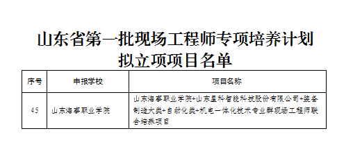 7月18日,山东省教育厅发布关于第一批现场工程师专项培养计划项目遴选评审结果,我校与山东星科智能科技股份有限公司联合申报的《山东海事职业学院+山东星科智能科技股份有限公司+装备制造大类+自动化类+机电一体化技术专业群现场工程师联合培养项目》成功通过立项。