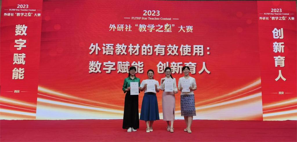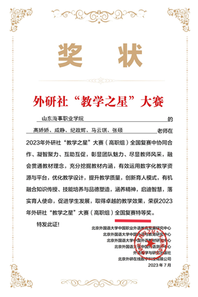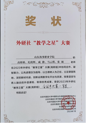 近日,我校参赛教师团队(高娇娇、纪政辉、咸静、马云琪、张硕老师)在2023年外研社“教学之星”大赛全国半决赛(高职组)中荣获一等奖,是该团队继六月份荣获该项赛事全国复赛(高职组)特等奖并晋级全国半决赛后的再次获奖。