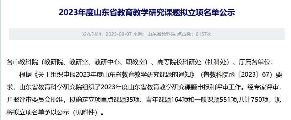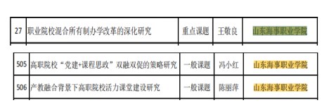 近日,山东省教育科学研究院公布了2023年度山东省教育教学研究课题立项名单,我校获批重点课题1项,一般课题2项。其中,校长王敬良主持的课题:《职业院校混合所有制办学改革的深化研究》获批重点课题立项,马克思主义学院院长冯小红主持的课题:《高职院校“党建+课程思政”双融双促的策略研究》和邮轮游艇学院教师陈丽萍主持的《产教融合背景下高职院校活力课堂建设研究》课题获批一般课题立项。