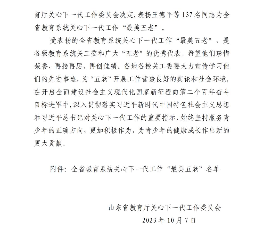 近日,山东省教育厅关心下一代工作委员会下发《山东省教育厅关心下一代工作委员会关于表扬全省教育系统关心下一代工作“最美五老”的通报》,我校教授督导室臧琪琳同志荣获全省教育系统关心下一代工作“最美五老”称号。