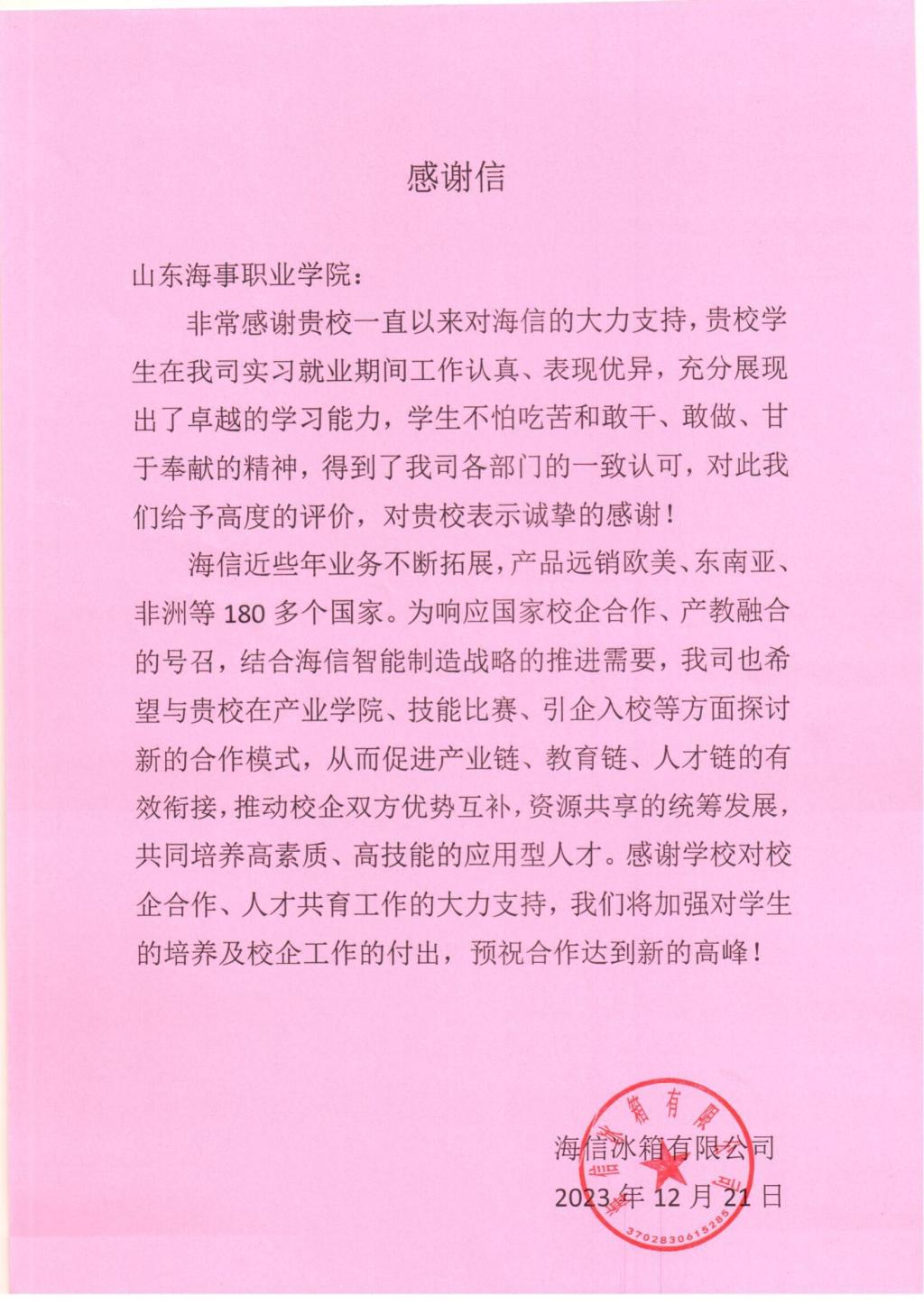 近日,山东海事职业学院机电工程学院收到海信冰箱有限公司(以下简称“海信公司”)发来的感谢信。信中,海信公司十分感谢我校一直以来对海信的大力支持,并对我校学生在实习期间认真工作、不怕吃苦、敢干、敢做、甘于奉献的精神表示高度认可和诚挚感谢。同时,海信公司在信中表示,希望与我校在产业学院、技能比赛、引企入校等方面探讨新的合作模式,推动校企双方实现优势互补,资源共享的统筹发展,共同培养高素质、高技能的应用型人才。