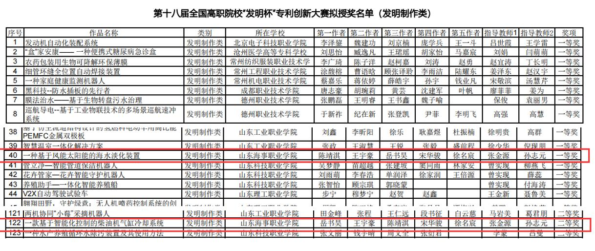 近日,第十八届全国高职院校“发明杯”大学生专利创新大赛结果揭晓,我校参赛项目《一种基于风能太阳能的海水淡化装置》与《一款基于智能化控制的柴油机气缸冷却系统》分别获得大赛一等奖和二等奖。