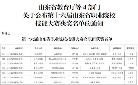 近日,山东省教育厅等4部门发布《关于公布第十六届山东省职业院校技能大赛获奖名单的通知》(鲁教职函〔2024〕8号),学校喜获一等奖1项,三等奖6项。