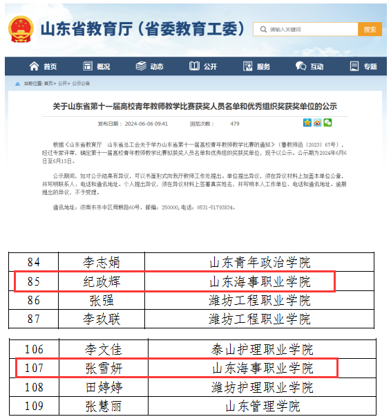 近日,山东省教育厅对第十一届高校青年教师教学比赛获奖人员名单和优秀组织奖获奖单位进行了公示,我校航海学院纪政辉老师获得二等奖,邮轮游艇学院张雪妍老师获得三等奖。
