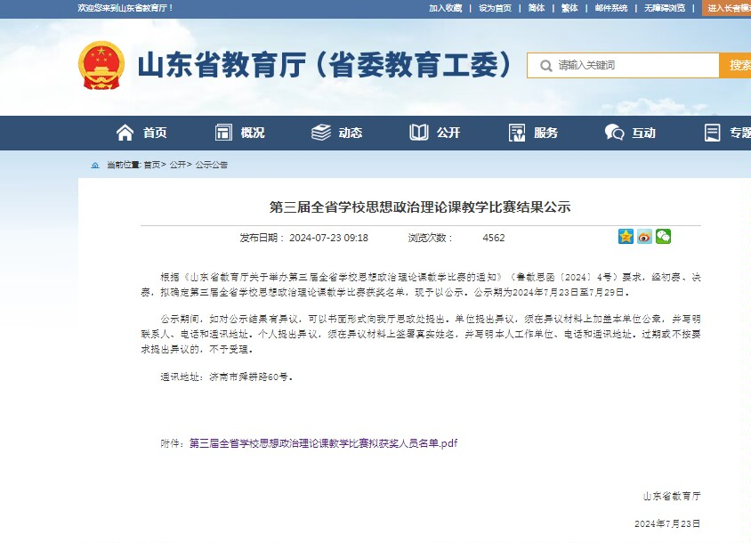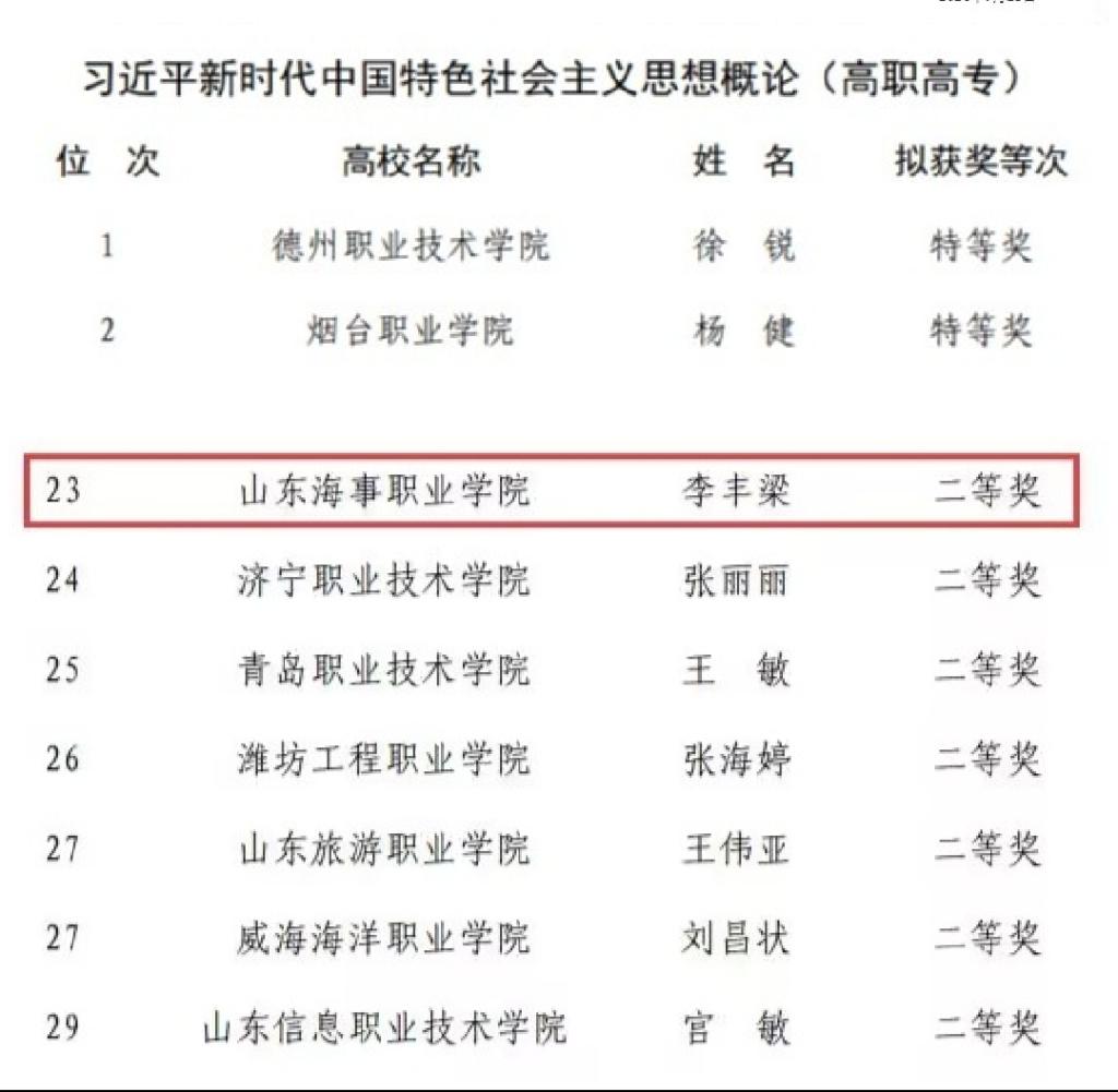 近日,省教育厅官网发布《第三届全省学校思想政治理论教学比赛结果公示》,我校思政教师李丰梁在《习近平新时代中国特色社会主义思想概论(高职高专)》中获得二等奖。
