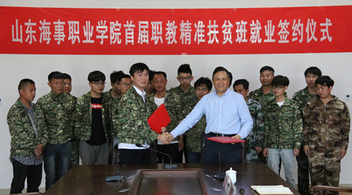 2016年10月16日,首届“职教精准扶贫班”在学院开班,启动“短平快”的值班水手、值班机工和海船厨师三个培训项目,做到早培训、早就业、早脱贫、早见效。2017年5月经过六个月的系统学习,16名来自菏泽地区的贫困学子完成了值班水手、值班技工、海船厨师等项目的海员培训课程,并取得了相应的适任证书,中远对外劳务合作(深圳)公司现场对学员进行了面试考核,并代表公司与通过考核的学员们签署就业协议。
