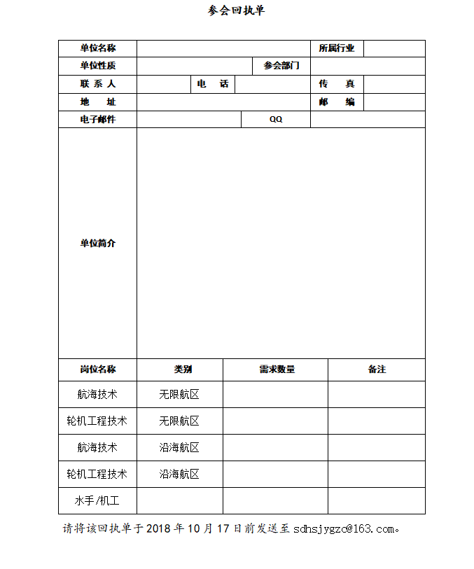 2.参会单位请于10月17日前将参会回执、单位营业执照(或复印件加盖公章)照片等材料发送至我校招聘专用邮箱sdhsjygzc@163.com。