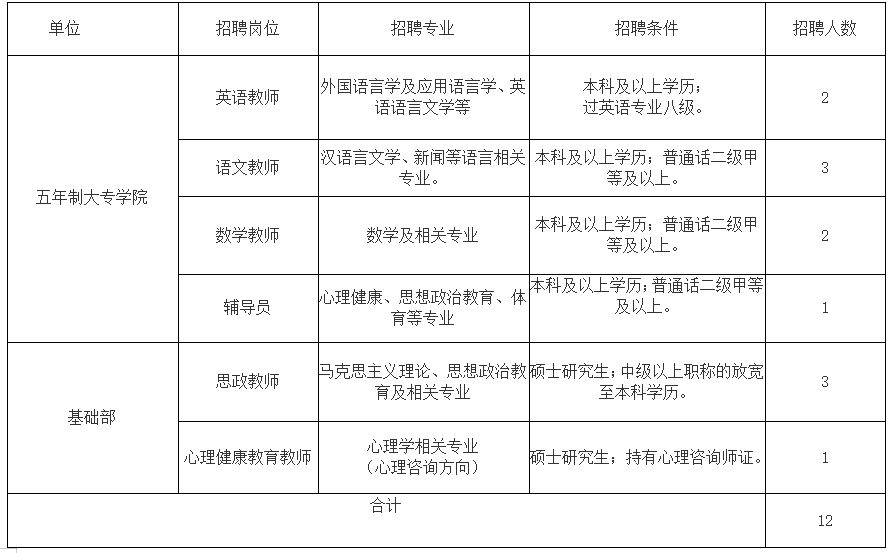 根据学校教学工作需要,拟面向社会公开招聘12名教职工,现将有关要求公告如下: