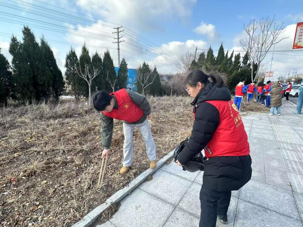 上午,志愿者们齐聚学校周边街道,身着整齐的志愿服,手持扫帚、垃圾袋等工具,干劲十足。一部分志愿者专注于清扫路面,仔细拾捡垃圾与落叶,确保道路的清洁;另一部分志愿者则致力于清除电线杆与墙壁上的非法小广告,还原公共空间的整洁面貌。与此同时,还有一支队伍走进街道旁的绿化带,或蹲或伏,用夹子、甚至徒手一点点清理夹杂在草丛中的烟蒂、纸片、包装袋等废弃物。经过一上午的努力,街道和绿化带整洁如新,志愿者们带着满足感到达了固堤场村社区广场。