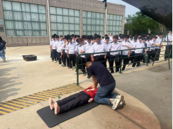“勇者征途”职业体验区成为活动亮点。学生们在专业教师指导下,学习旗语通信、急救技能、绳结操作及消防应急处置,通过沉浸式演练感受海员职业的挑战与担当,现场气氛活跃。