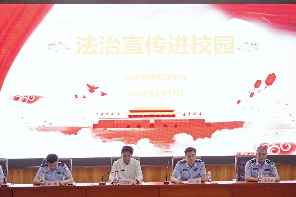 值此全国第24个"安全生产月"活动深入开展之际,为扎实推进平安校园建设,提升师生法治素养与安全防范能力,近日,我校在图书馆报告厅举办"法治校长进校园"活动。潍坊市公安局滨海分局副局长、我校法治校长兰涛,携刑警大队大队长于海鹏、大学园派出所副所长王丽鹏、刑警大队信息中队队长刘利等公安干警走进校园,为师生带来一场别开生面的法治教育盛宴。