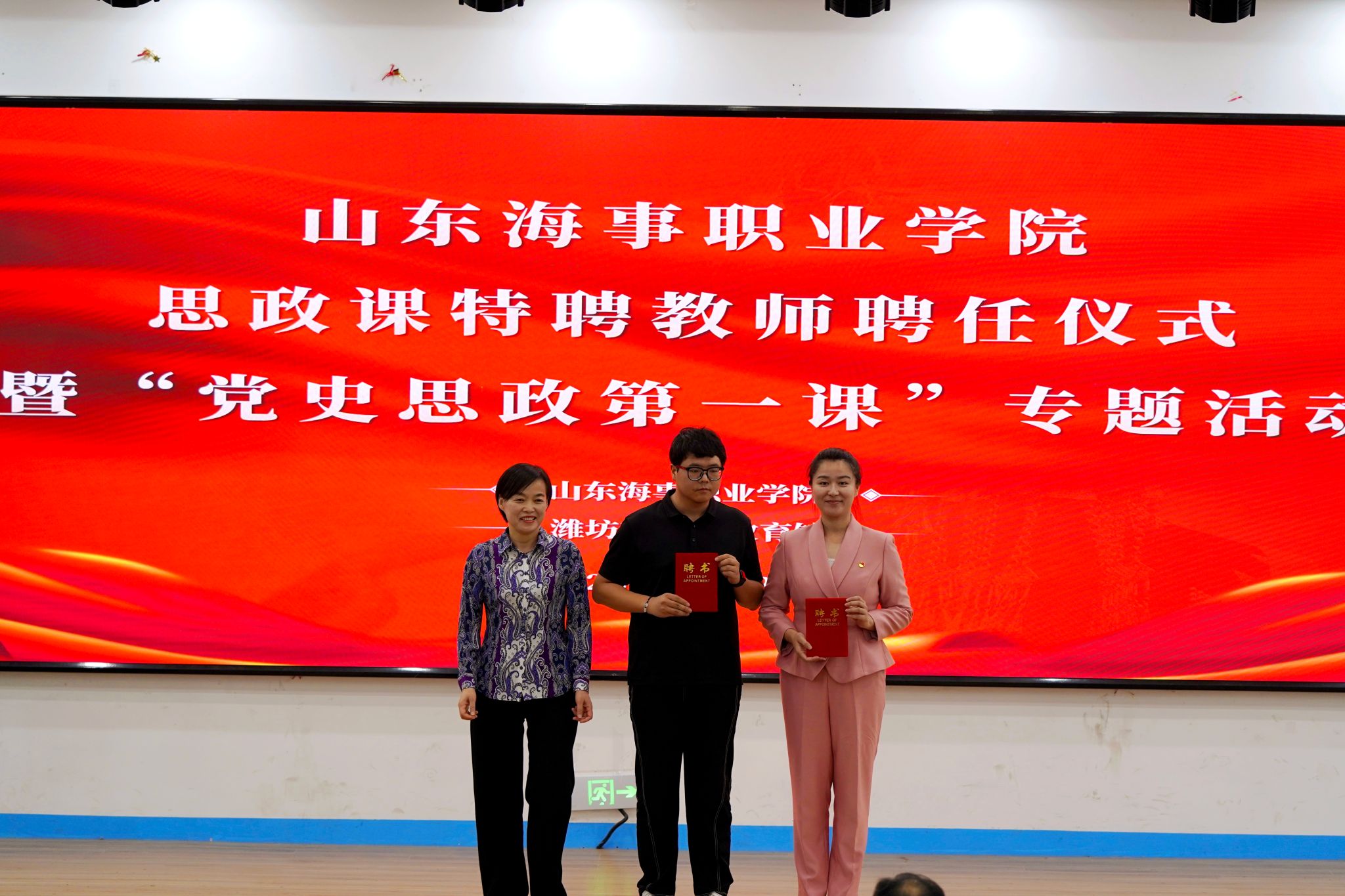 9月25日,山东海事职业学院思政课特聘教师聘任仪式暨“党史思政第一课”专题讲座在我校顺利举行。省派党建工作指导员谭启忠,潍坊市党史教育馆综合科王鑫、张浩磊,我校马克思主义学院院长冯小红、党建工作科科长尚子瑜参加活动。活动由我校马克思主义学院教研室主任葛晓彤主持。