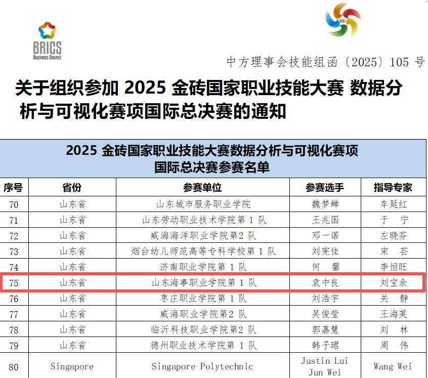 近日,2025金砖国家职业技能大赛中国赛区数据分析与可视化赛项山东省选拔赛圆满落幕,我校刘宝余老师指导的2024级电商专业袁中良从全省86支参赛队伍中脱颖而出,以第6名成绩成功晋级国际总决赛。